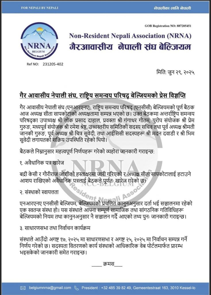 यसैगरी, एनसीसी बेल्जियमको साधरणसभा अगष्ट १७ र चुनाव अगष्ट २५, २०२५ मा गर्ने निर्णय भएको कार्यवाहक महासचिव राजेन्द्र कुमार कार्कीले जानकारी दिए । बैठकमा अन्तर्राष्ट्रिय समन्वय परिषद्का उपाध्यक्ष लोक प्रसाद दाहाल, प्रवक्ता गंगाधर गौतम, युरोप संयोजक प्रेम गुरुङ, मध्यपूर्व संयोजक रमेश श्रेष्ठ, पूर्व अध्यक्षद्वय जानकी गुरुङ, चित्र सुवेदी लगायतको सहभागिता थियो ।