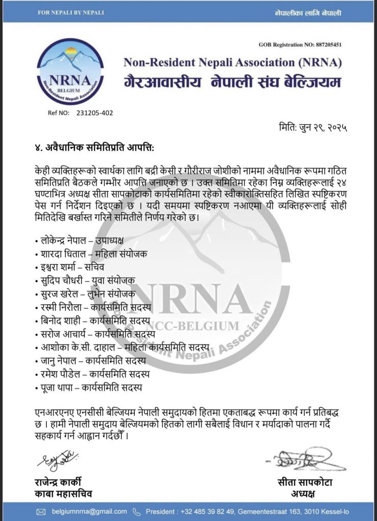 एनआरएनए बेल्जियमकी अध्यक्ष सीता सापकोटाको अध्यक्षतामा आइतबार बसेको पूर्ण बैठकले निर्वाचित कार्यसमितिलाई भंग गर्ने भनिएको पत्रलाई अवैधानिक ठहर गर्दै खारेज गरिदिएको हो ।