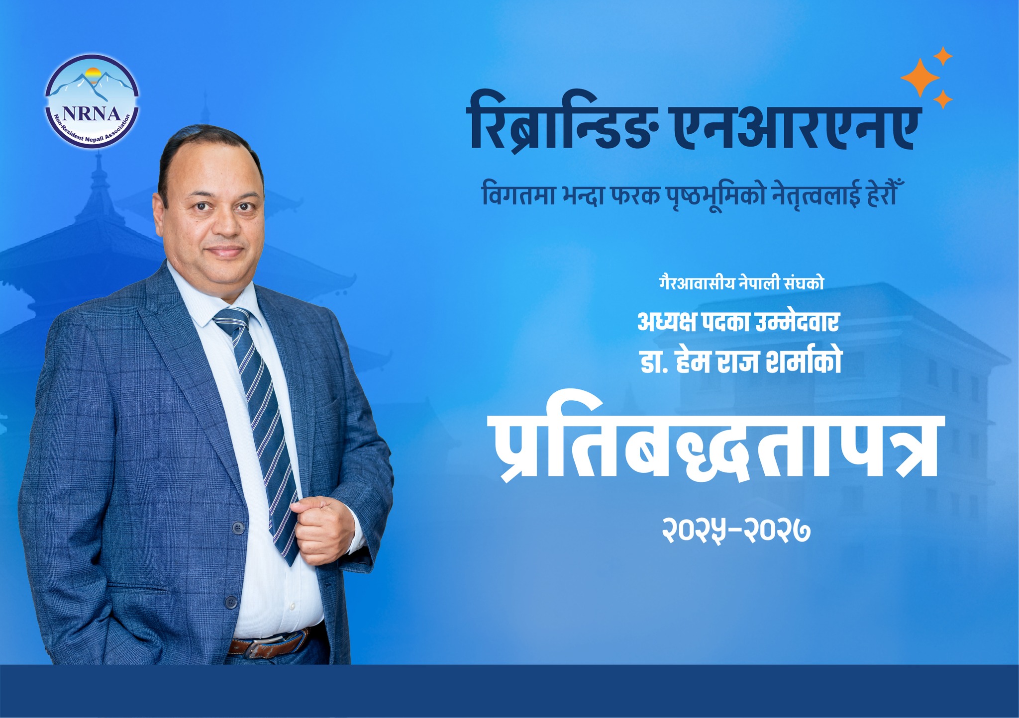 बेलायतस्थित लिभरपुल विश्वविद्यालयमा भौतिक शास्त्रका प्राध्यापक डा. शर्माले विगतमाभन्दा फरक पृष्ठभूमिको नेतृत्वलाई हेरौं भन्दै आसन्न १२औं महाधिवेशनमार्फत अध्यक्ष पदमा निर्वाचित भई फरक र नवीन दृष्टिकोणसहित एनआरएनएको रिब्रान्डिङ गर्ने प्रतिबद्धता व्यक्त गरे । गैरआवासीय नेपाली संघको स्थापनाकालदेखि संस्थामा सक्रिय डा. शर्माले संघको अभियानकै परिणामस्वरूप नेपाल सरकारले गैरआवासीय नेपाली सम्बन्धी ऐन, नागरिकता, लगानी, आप्रवासी श्रमिकसँग सम्बन्धित सामाजिक सुरक्षालगायत महत्त्वपूर्ण मुद्दाहरू सम्बोधन गरेको बताए ।
