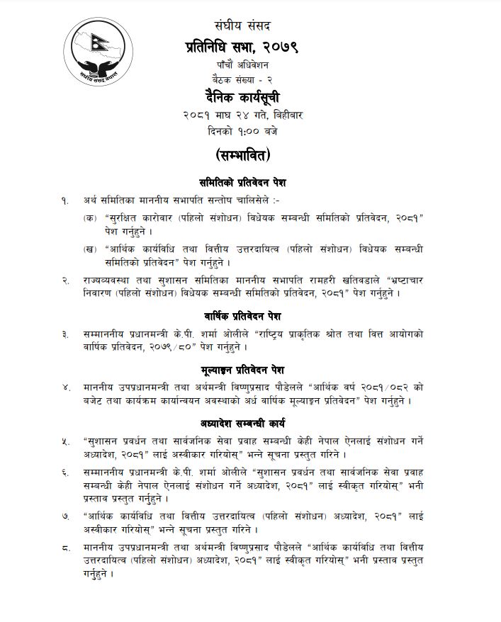 संसद सचिवालयका अनुसार प्रधानमन्त्री केपी शर्मा ओलीले ‘राष्ट्रिय प्राकृतिक श्रोत तथा बित्त आयोगको बार्षिक प्रतिवेदन, २०७९÷८० पेश गर्ने’ कार्यसुचीमा उल्लेख गरिएको छ ।