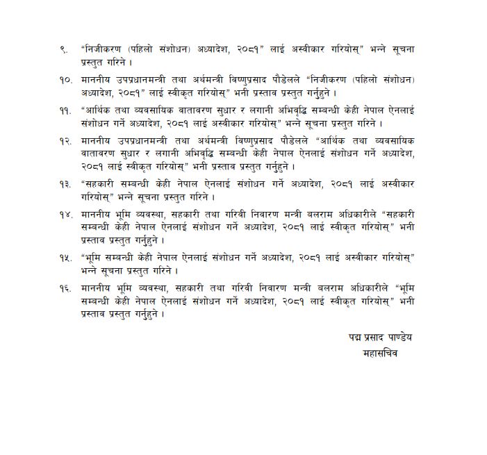 जसअनुसार “सुशासन प्रवर्धन तथा सार्वजनिक सेवा प्रवाह सम्बन्धी केही नेपाल ऐनलाई संशोधन गर्ने अध्यादेश, आर्थिक कार्यविधि तथा वित्तीय उत्तरदायित्व (पहिलो संशोधन) अध्यादेश, “निजीकरण (पहिलो संशोधन) अध्यादेश, “आर्थिक तथा व्यावसायिक वातावरण सुधार र लगानी अभिवृद्धि सम्बन्धी केही नेपाल ऐनलाई संशोधन गर्ने अध्यादेश, “सहकारी सम्बन्धी केही नेपाल ऐनलाई संशोधन गर्ने अध्यादेश र “भूमि सम्बन्धी केही नेपाल ऐनलाई संशोधन गर्ने अध्यादेश निर्णायार्थ प्रस्तुत गरिने भएको छ ।